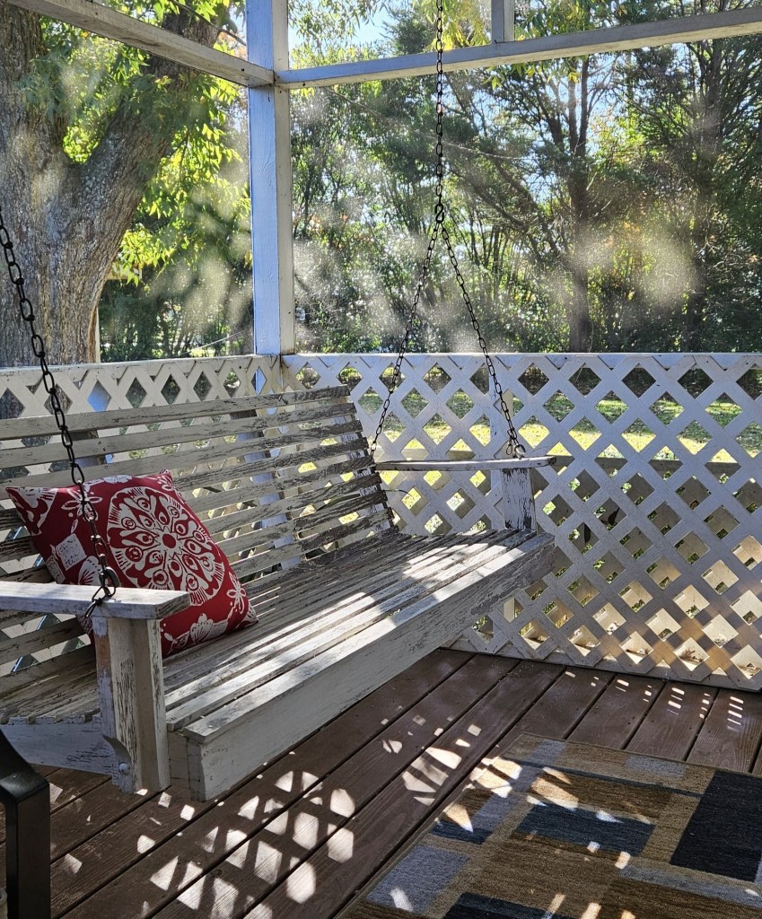 I miss my wife and I often think about what we’re missing together. It’s the simple things that get my attention. I play my guitar often. One day I was playing and looked out the back door onto the screened porch. I looked at the swing and thought about her. The swing was empty except for a pillow Katie had placed there. The weather was perfect. Leaves were falling from the pecan trees. Fall was in the air. The sunshine was filtering in through the tree limbs. The temperature was perfect for sitting out there. I could almost hear her saying plain as day, “If it would just stay like this all the time it wouldn’t bother me one bit.” It’s all I’ve got left now. I sat in the swing another nice day, I cried and I smiled, telling her that this is nice, but I bet it’s nicer where she was.